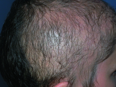 拔毛癖患者头皮顶部局部出现毛发明显稀少,头皮裸露,表现为形状不规则、边界不整齐的不完全性脱发斑,表面分布较多针尖样毛囊。