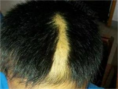 拔毛癖多见于儿童,表现为前发际线到头顶位置有一条宽且长的不规则脱发区,会露出淡黄色的头皮,其上有少量参差不齐和断离的头发,是患者在不良情绪下撕扯自己的头发导致。