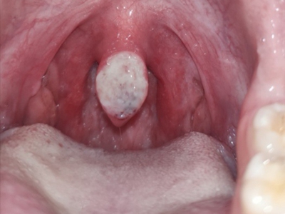 重型阿弗他溃疡可发生于患者口腔内的悬雍垂,其上有大片白色斑块样溃疡,患者自觉明显疼痛,愈合后可遗留瘢痕,严重者可导致悬雍垂组织缺损。