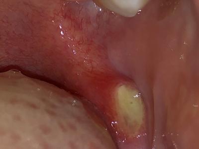 重型阿弗他溃疡患者一侧口腔黏膜上可见较大的椭圆形溃疡,溃疡面深陷,表面为浅黄色假膜,可伴有灼痛感,摄入刺激性饮食时疼痛感会加重。
