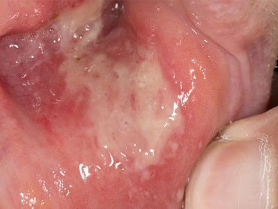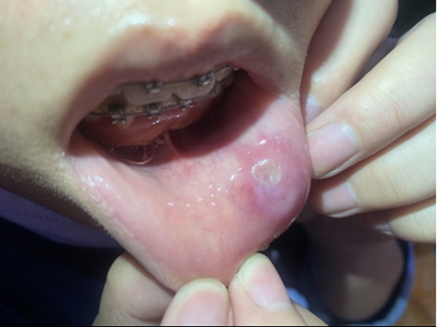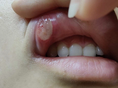 重型阿弗他溃疡患者下唇内黏膜有一个黄豆大小的溃疡面,表面覆盖一层黄白色的假膜,周围组织红肿、隆起,患者感觉患处疼痛感剧烈。