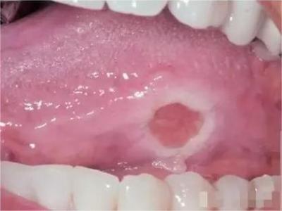 重型阿弗他溃疡患者舌侧可见一个弹坑样溃疡,整体呈圆形,溃疡面开始为白色膜状物,擦掉后可见粉红色黏膜,患者进食时疼痛感明显。