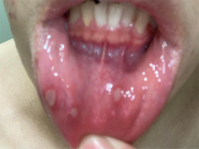 重型阿弗他溃疡患者下嘴唇内侧出现多个溃疡,呈类圆形,大小不等,界限清晰,溃疡面为白色,表面凹陷,患者自觉有明显的灼痛感,吃饭时更严重。