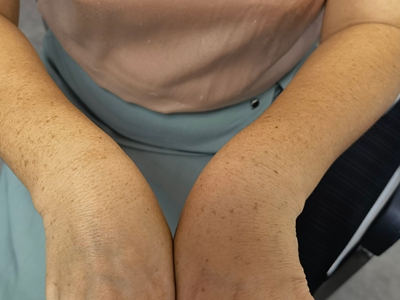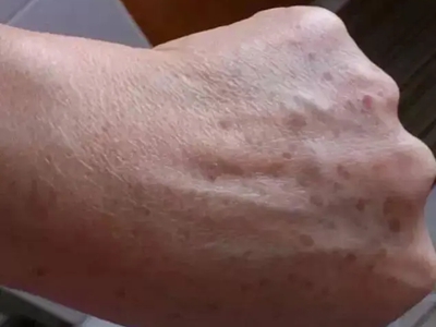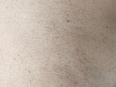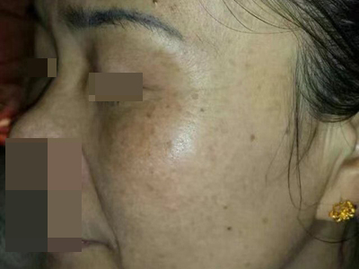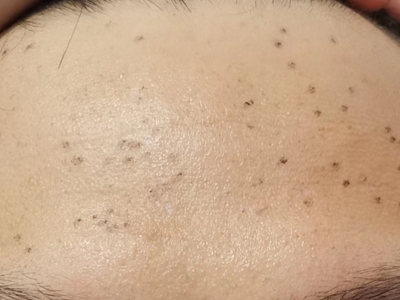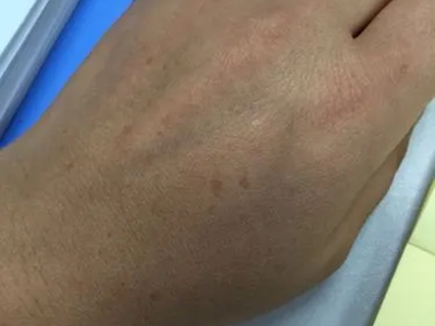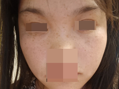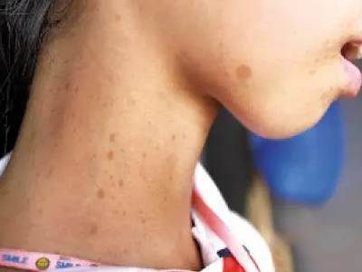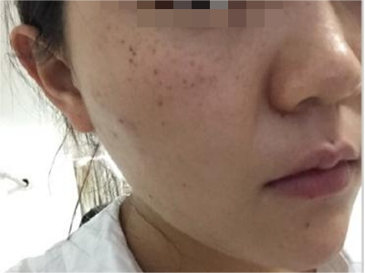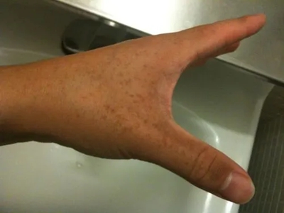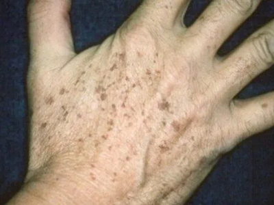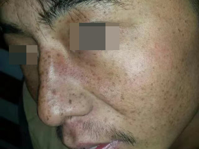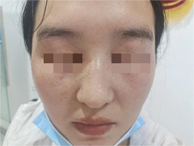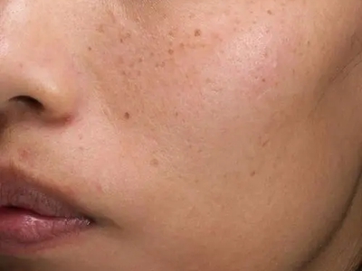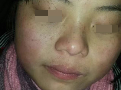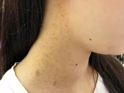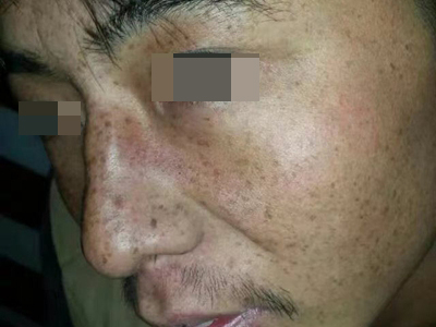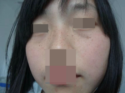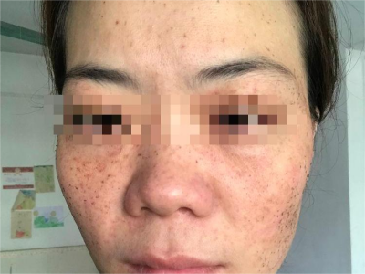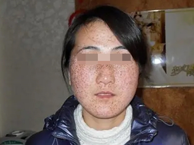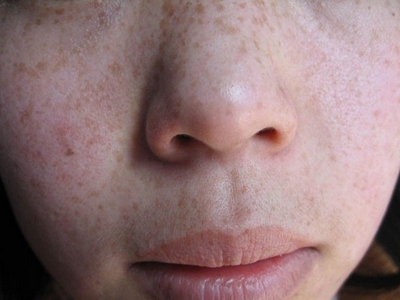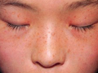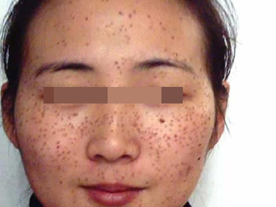 雀斑患者前额有多个黑色斑点散在分布,大小不等,为针尖至米粒大小的浅褐色小斑点,边界清楚。通常患者无自觉症状,夏季因日晒而增多,颜色亦加深。