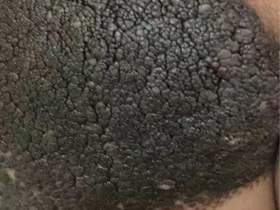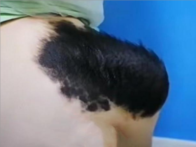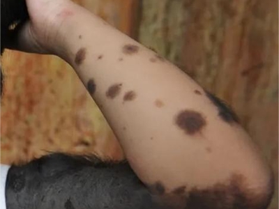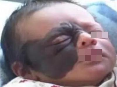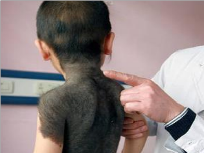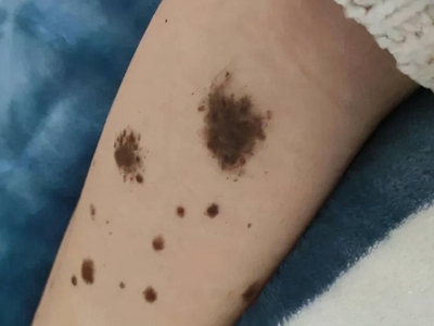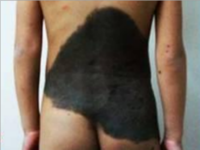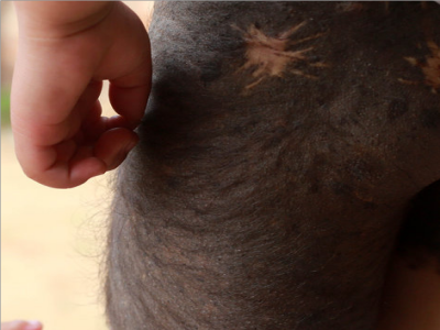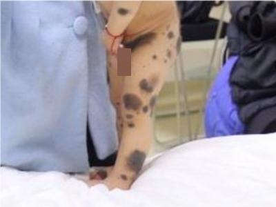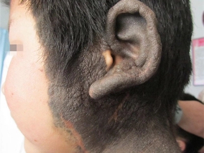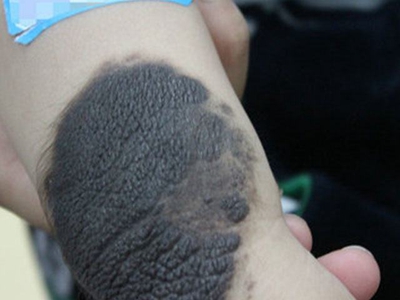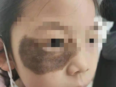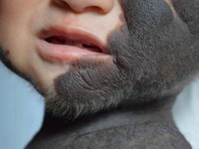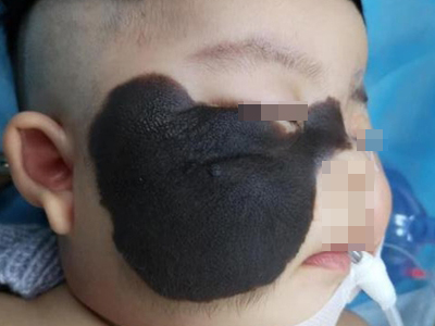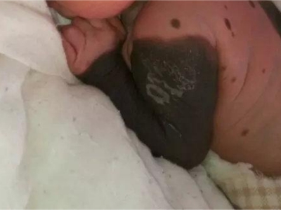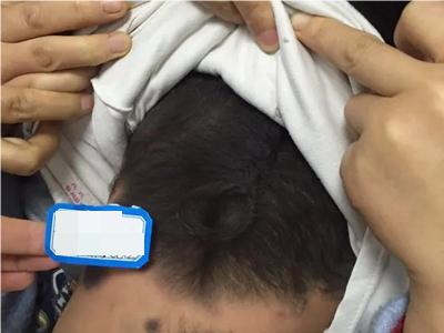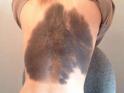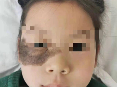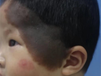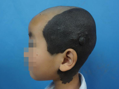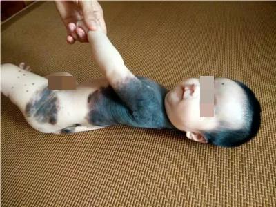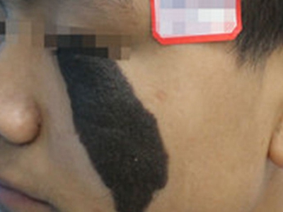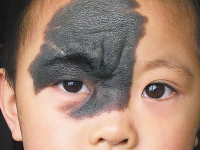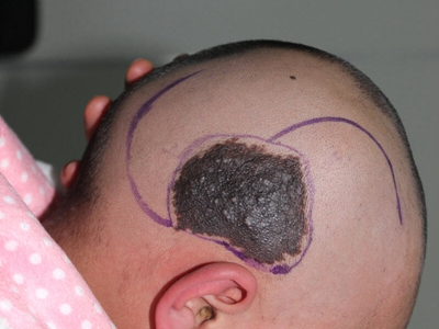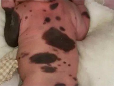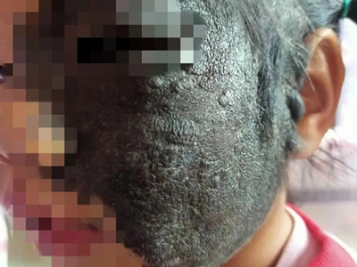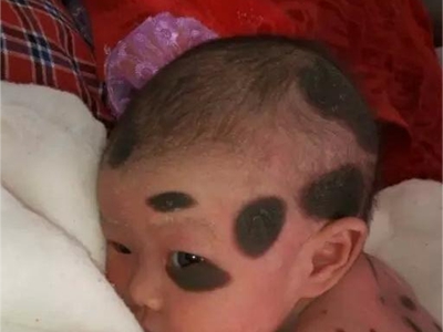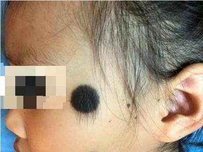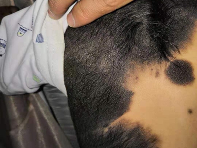兽皮痣出现在头部,表现为一块黑斑,略凸起于皮肤表面,上面凹凸不平,呈膨隆状,有类似疙瘩一样的皮损,黑斑接近于婴儿手掌的大小。