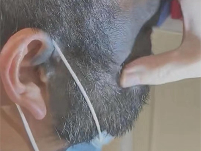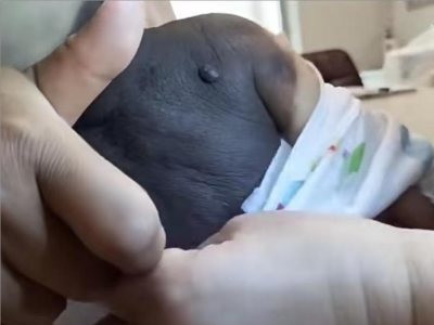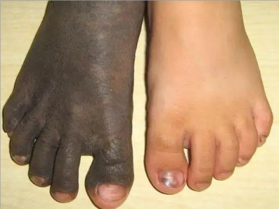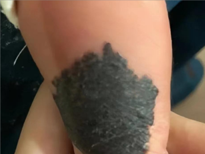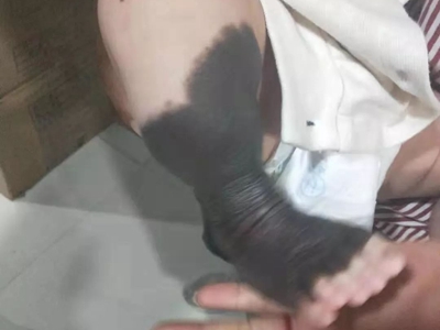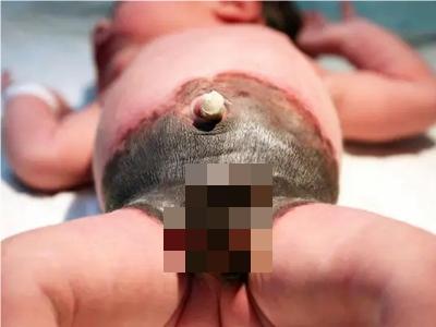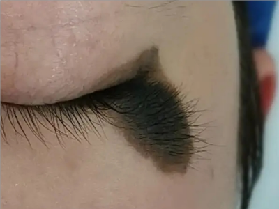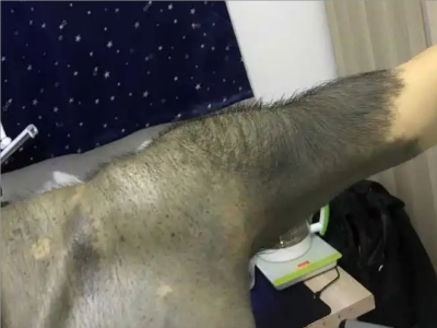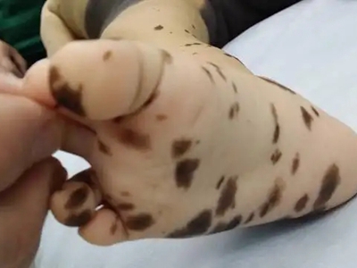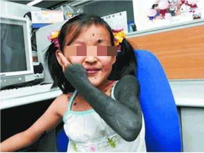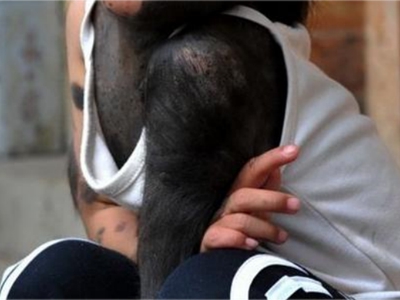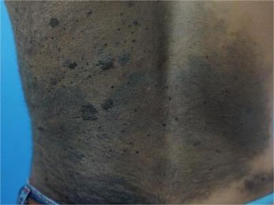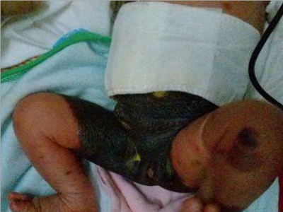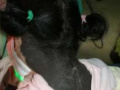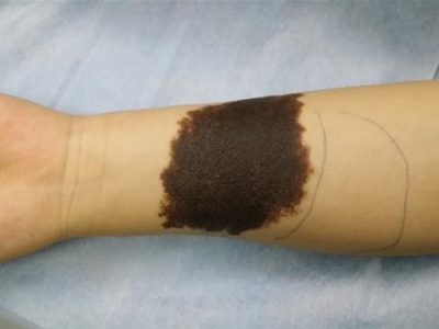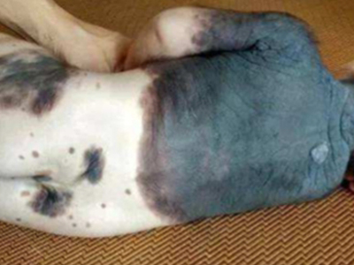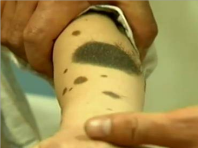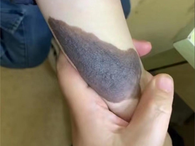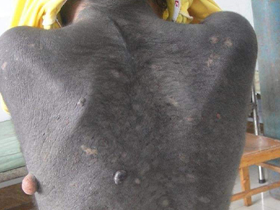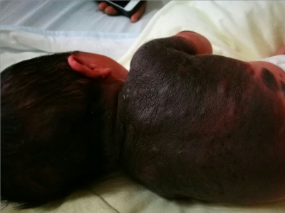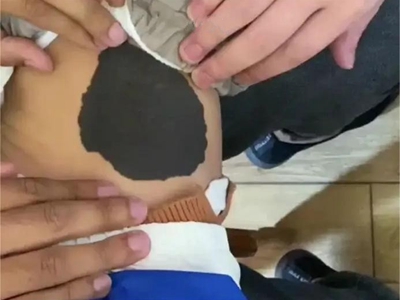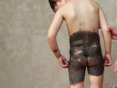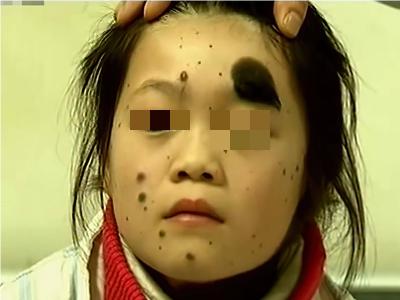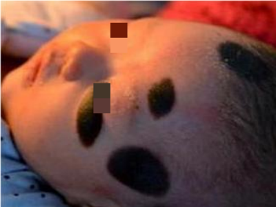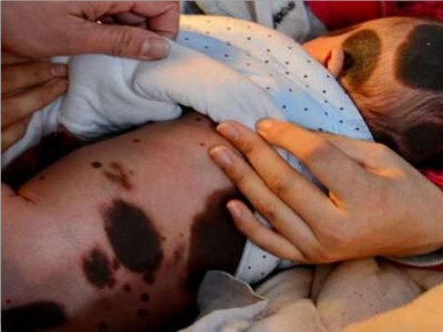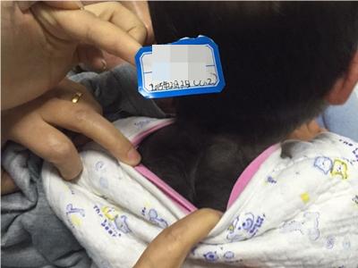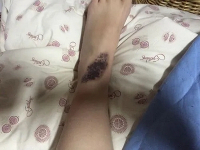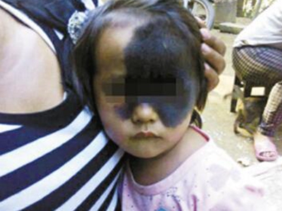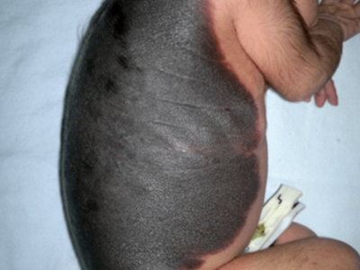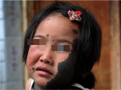 兽皮痣出现在头部,表现为一块黑斑,略凸起于皮肤表面,上面凹凸不平,呈膨隆状,有类似疙瘩一样的皮损,黑斑接近于婴儿手掌的大小。