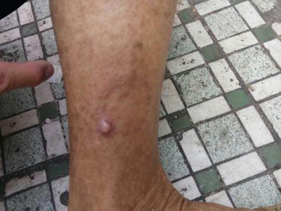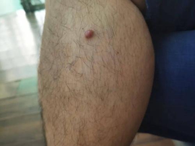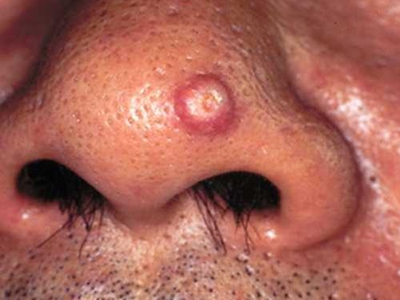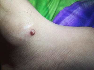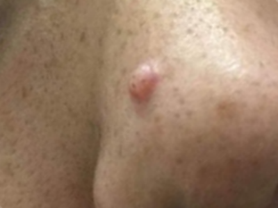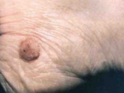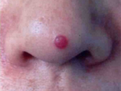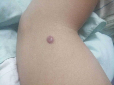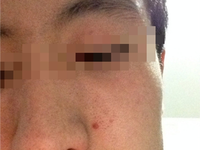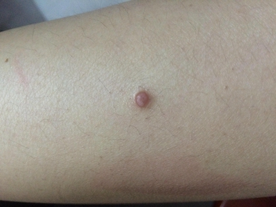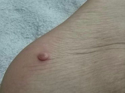 小汗腺汗孔瘤皮损单发,为肉色圆形凸起的小疙瘩,约绿豆大小,触之坚实,与周围皮肤分界明显,位于面部,长期存在不能消退,患者多无其他伴随症状。