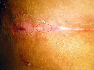 骶尾部藏毛窦初起表现为单发的脓肿,直径较大,表皮破溃后流血、渗液,干涸后形成红色结痂覆盖。日常不要用手抓挠,以免引起感染,加重病情。