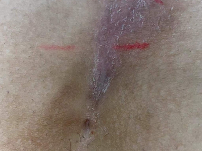 骶尾部藏毛窦患者骶尾部旁边长了一个椭圆形结节,边缘向下凹陷,低于皮肤表面,形成凹坑,中央结节为紫红色,表面有白色鳞屑覆盖,用手触摸感觉质地较硬。