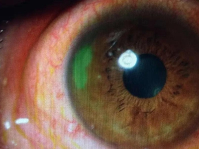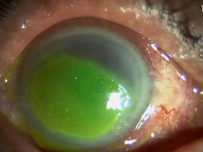 角膜挫伤眼睛的角膜有一大块黄绿色斑块,几乎覆盖整个眼球,除荧光绿色的斑块外,剩余角膜呈白色浑浊样,角膜下有部分红血丝,无法视物,病情较重。