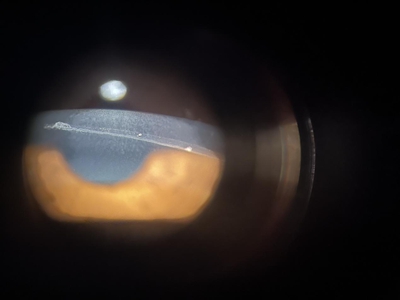 角膜挫伤患者在裂隙灯目镜下,见角膜上皮出现划伤状剥脱,伤口较长,伤口处有白色薄膜翘起,类似于白色条纹,患者有视物不清以及疼痛等症状。