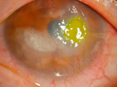 角膜挫伤进行性加重后,可逐渐出现角膜红肿像烂掉一样,布满红血丝,整个眼球褪色发黄浑浊,瞳孔处有荧光黄色的斑块,同时可见角膜出现溃疡。