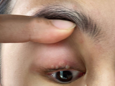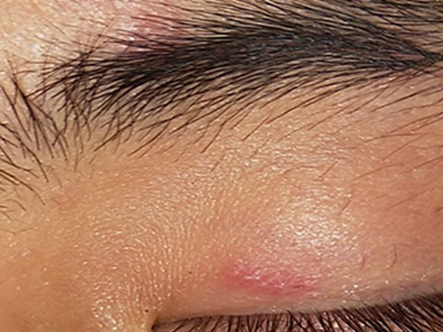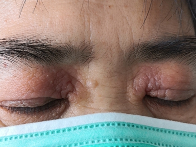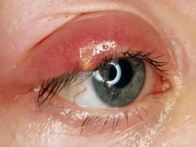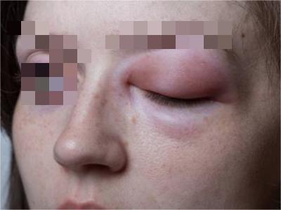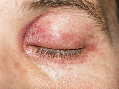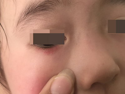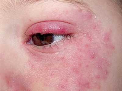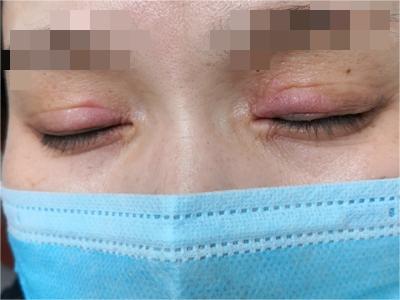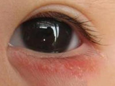 急性眼睑湿疹主要表现为红斑基础上的针尖至粟粒大小丘疹、丘疱疹,严重时可出现小水疱,常融合成片,境界不清楚,皮损周边的丘疱疹逐渐稀疏,常因搔抓形成点状糜烂面,有明显浆液性渗出。自觉瘙痒剧烈。