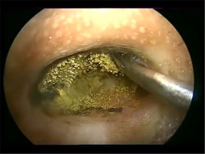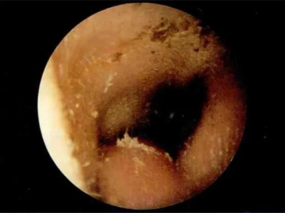 外耳道炎在检查时显示有很多黄色分泌物,附着在外耳道黏膜壁上,脓痂上还有白色豆腐渣状的鳞屑堆积,患者自觉耳痛、瘙痒、耳道潮湿。