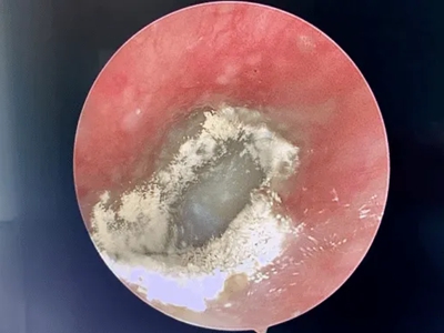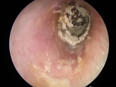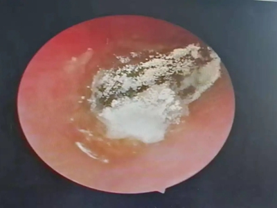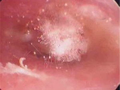 外耳道炎患者检查时显示外耳道有白色颗粒状鳞屑堆积,类似头皮屑,部分集结成大块,有鳞屑的部位黏膜发红,患者自觉耳朵里面瘙痒。