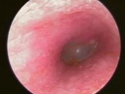 外耳道炎表现为外耳道侧壁红肿,上面有黄色颗粒状脓痂和白色细毛样鳞屑,看上去像发霉,同时侧壁上有一个小水疱,破裂后有液体流出,耳道潮湿。