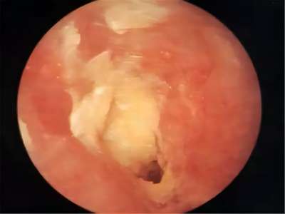 外耳道炎患者的外耳道黏膜潮红,伴随有肿胀感,并且附着大块黄白色脓痂,形状不规则,脓痂上有白色细密鳞屑,患者自觉耳部疼痛。