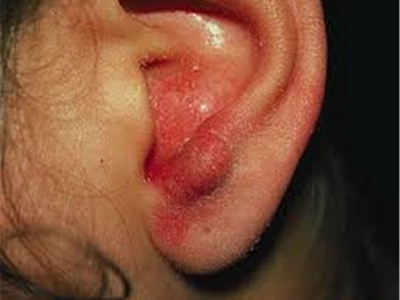 外耳道炎的患者耳洞周围发红、肿胀,上面有一层细密的鳞屑,并在耳廓上有一个球形的疙瘩,牵拉耳廓时患者感到疼痛,说话或咀嚼时疼痛加重。
