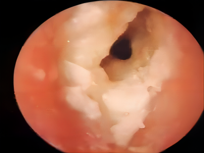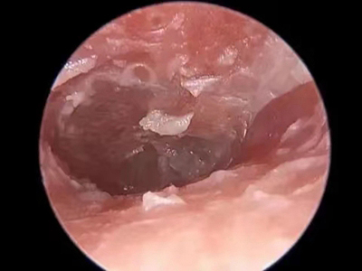 外耳道炎患者的外耳道侧壁呈鲜红色,水肿明显,上面有脓液干燥后形成的脓痂,脓痂上还附着有一层厚厚的鳞屑,不时有分泌物流出,严重时可出现听力下降。