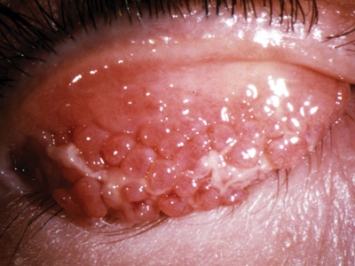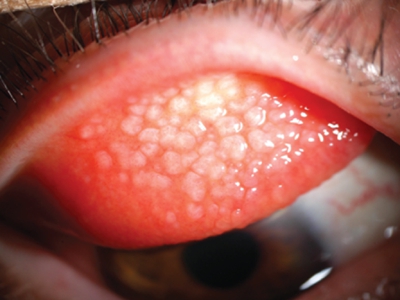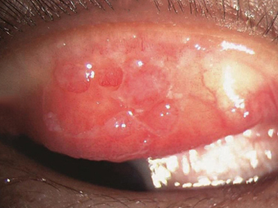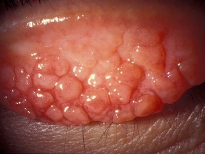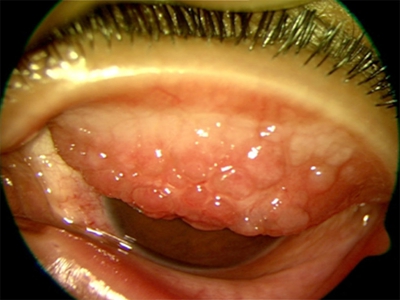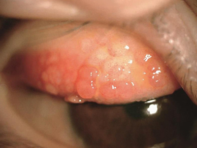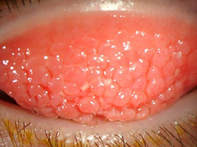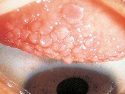 特应性角结膜炎会导致患者眼皮内有乳头状的赘生物,即密集分布的圆形小疙瘩,质地较软,大小中等,患者会同时伴有上皮下纤维化的症状。
