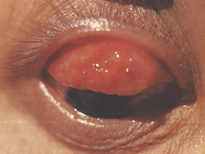 特应性角结膜炎导致患者眼皮内充血水肿,向内出现巨大肿物,眼皮发红,肿起的肉球遮挡眼球,眼皮皮肤变厚。此时需注意不要用手触碰局部,以免细菌残留,引发感染。