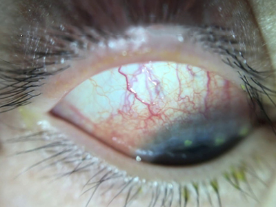 特应性角结膜炎患者结膜上有明显的较粗壮的血管,有些微凸起于结膜表面,眼球周围一圈泛白混浊,边界不清晰,同时眼睑会附着黄色分泌物。