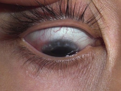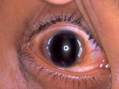 特应性角结膜炎导致患者眼球表面黑眼仁边缘一圈出现白点,附着于结膜下,眼白处结膜红血丝明显,此时患者有视物模糊、疼痛、怕光等异常症状。