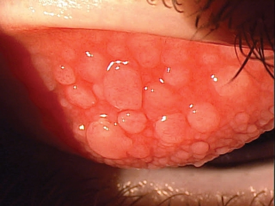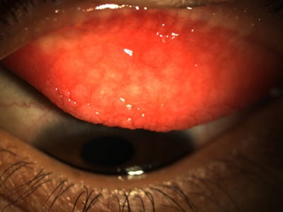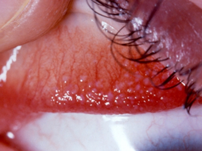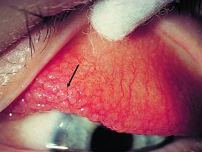 特应性角结膜炎发病时可见眼皮内苍白,局部长出许多小软疙瘩。此症状为配戴眼镜或眼睛假体植入等不耐受导致,出现眼痒,视物模糊的感觉。