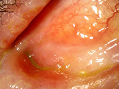 特应性角结膜炎患者眼皮翻开后有明显的红血丝,还伴随黄色的黏性分泌物,眼睑边缘也会附着干的分泌物,此时可遵医嘱使用眼药冲洗治疗。