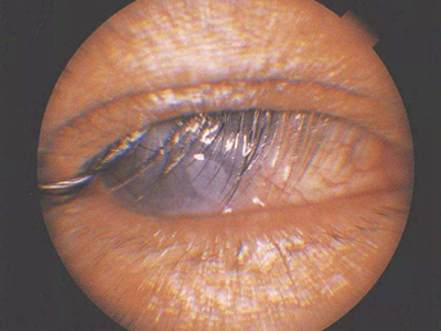 特应性角结膜炎好发于老年人。睑结膜中等大小的乳头,伴有上皮下纤维化,晚期形成结膜瘢痕,有时会发展成睑球粘连。慢性上皮病变损害角膜缘干细胞后,形成广泛的角膜新生血管。