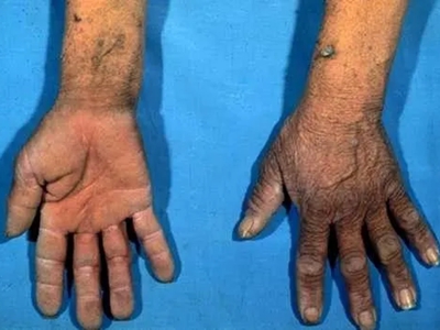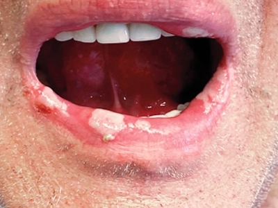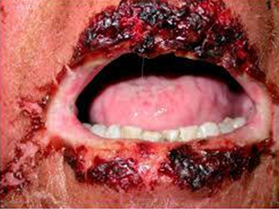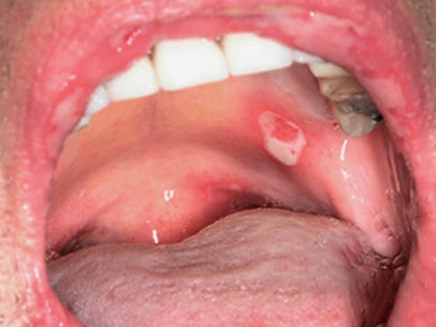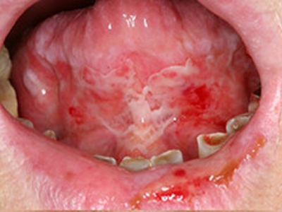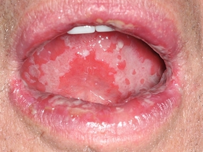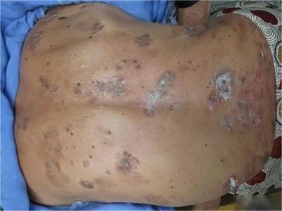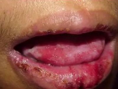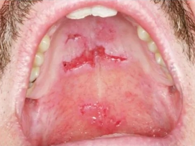 1、黏膜皮肤损害:副肿瘤性天疱疮常以口腔黏膜炎为首发症状,表现为广泛、难治性的溃疡、水疱、糜烂等,患者口唇分泌物增加、疼痛,拒食,常见口唇糜烂、渗血、血痂等;病变部位除口腔黏膜外,亦可累及眼结膜、咽喉部、呼吸道、肛周生殖器等部位。少数患者以皮疹为首发症状,皮损呈多形性,常泛发于头颈部、前胸后背和肢体近端。皮损随病情加重及缓解动态变化,同一人可见不同类型皮损。掌趾部常可见脱屑、红斑、水疱、溃烂及指甲损害、甲沟炎、甲脱落、甲周红肿等。