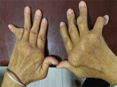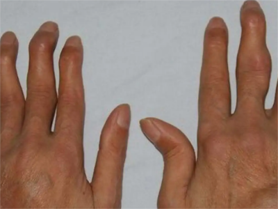 氟骨症患者手指骨骼变形,手指关节粗大且异常弯曲畸形,无法伸直,患者会出现持续性疼痛感,严重影响手指的正常活动,患者常伴发氟斑牙。