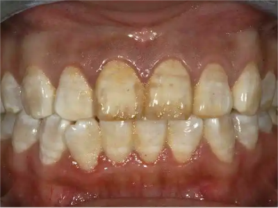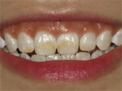 氟斑牙患者的牙齿表面有黄褐色斑点或斑块,牙釉质表面失去光泽并出现缺损,缺损呈条状、点状、块状,缺损内的颜色为暗褐色,此时症状较严重,应及时治疗。