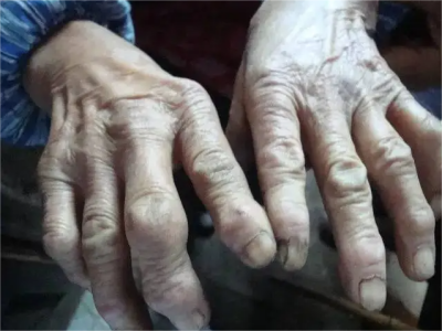 氟骨症会侵犯双手的手指关节,表现为关节增生、异常粗大,手指变形,同时患者感觉有刀割样剧烈疼痛感,拒碰触,活动后有所缓解。