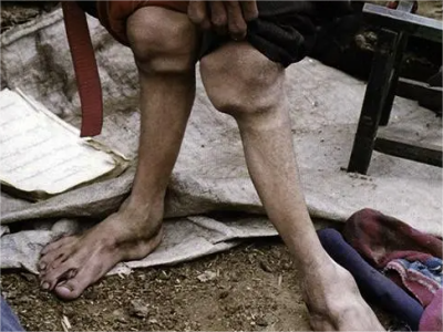 氟骨症严重患者双侧小腿僵硬、骨骼弯曲变形,相互交叉呈“X”型,伴有疼痛感,无法正常行走,瘫痪在床,多与长期进食含有氟化物的食物有关。
