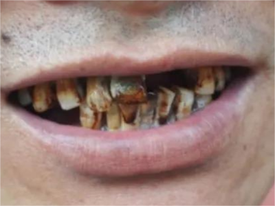 氟骨症会累及牙齿,表现为牙齿表面着色,出现不同程度的颜色改变,出现黄褐色斑,甚至整个牙齿呈黄褐色至深褐色。同时牙齿表面见细小的条状裂纹,密集分布,触摸牙齿粗糙不平。