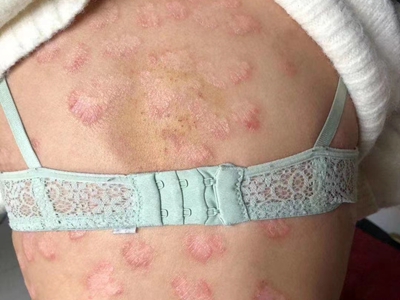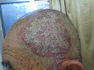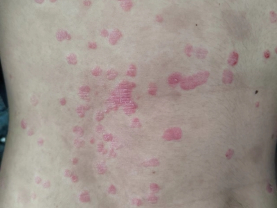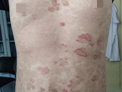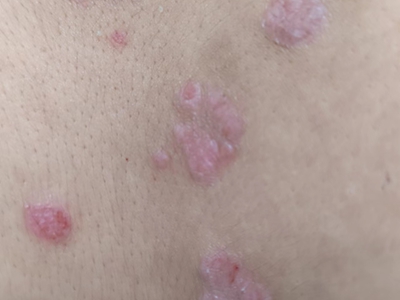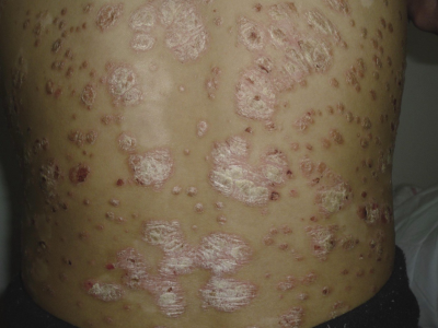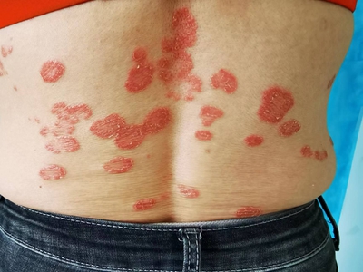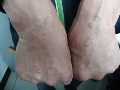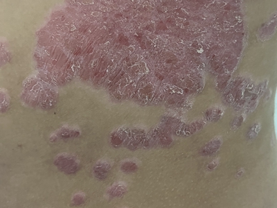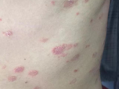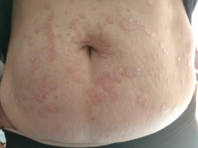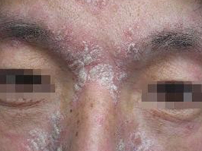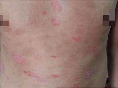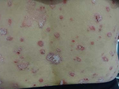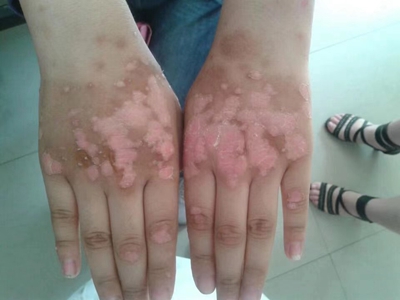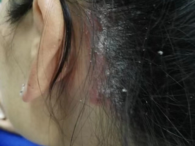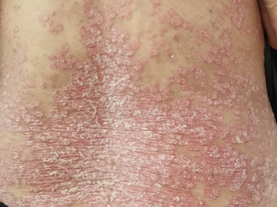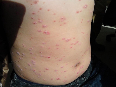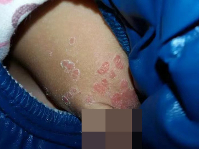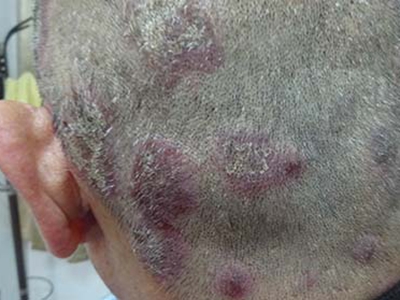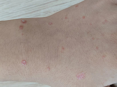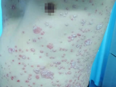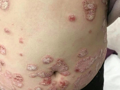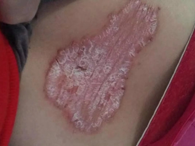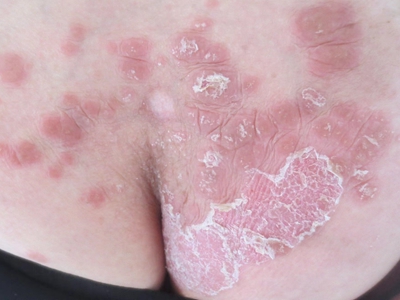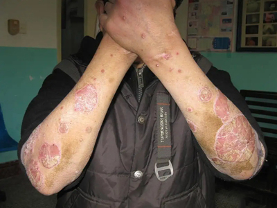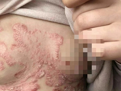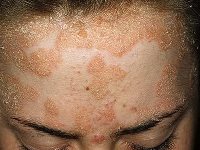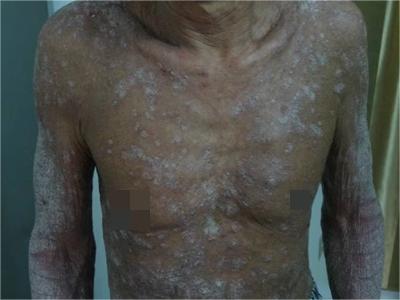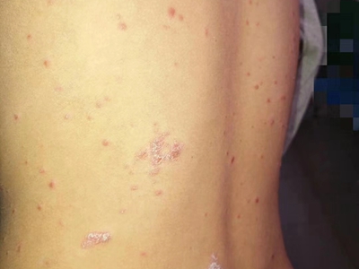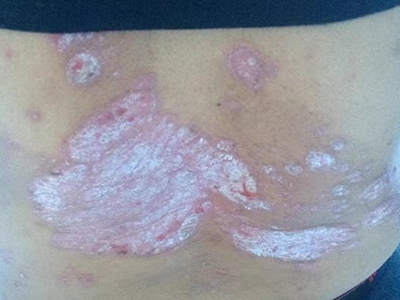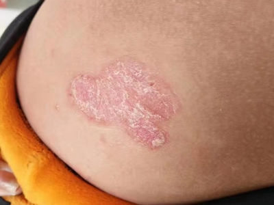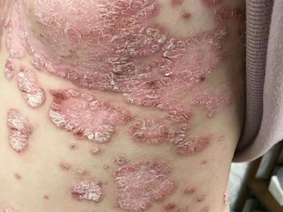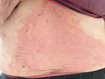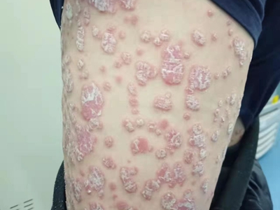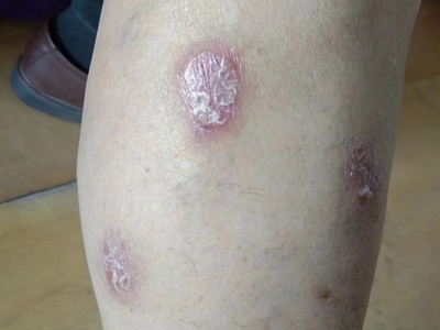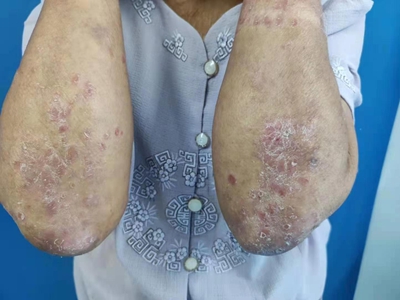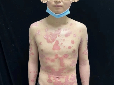 皮损可发生于全身各处,但以四肢伸侧,特别是肘部、膝部和骶尾部最为常见,常呈对称性。不同部位的皮损也有所差异,面部皮损多为点滴状浸润性红斑、丘疹或脂溢性皮炎样改变;头皮皮损鳞屑较厚,常超出发际,头发呈束状;腋下、乳房和腹股沟等皱褶部位常由于多汗和摩擦,导致皮损鳞屑减少并可出现糜烂、渗出及裂隙;少数损害可发生在唇、颊黏膜和龟头等处,颊黏膜损害为灰白色环状斑,龟头损害为边界清楚的暗红色斑块;甲受累多表现为“顶针状”凹陷。患者多自觉不同程度瘙痒。