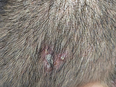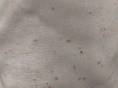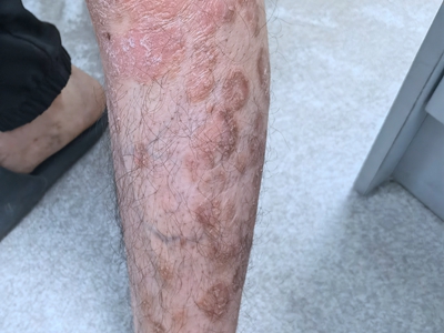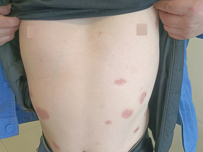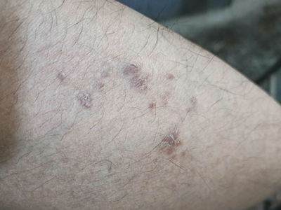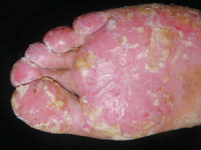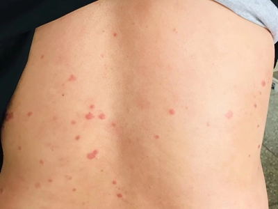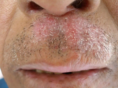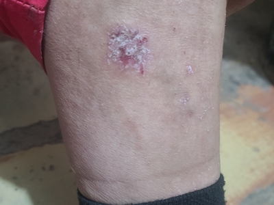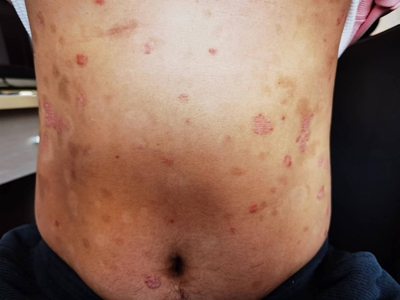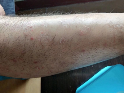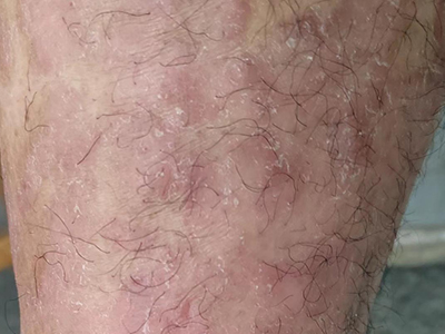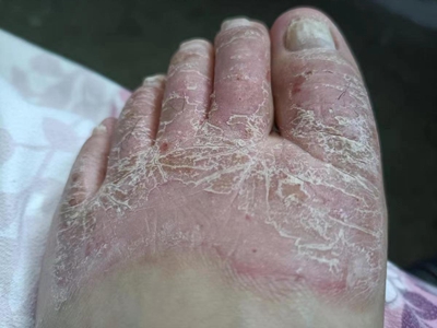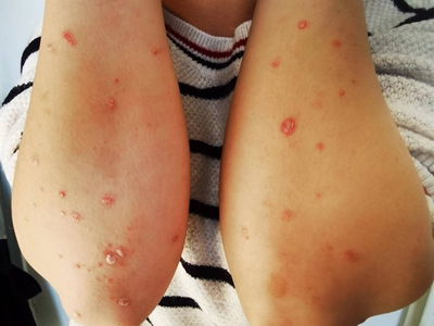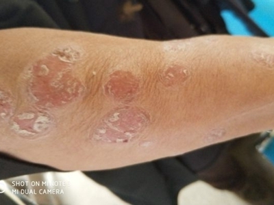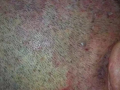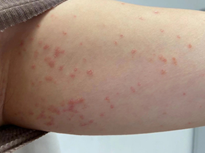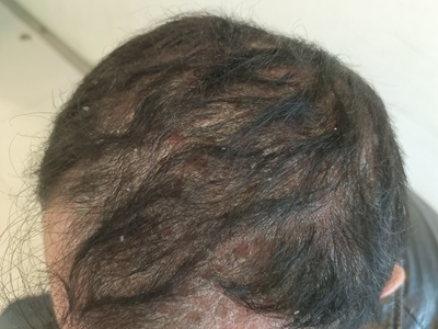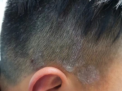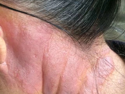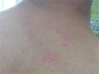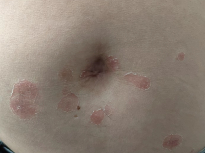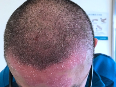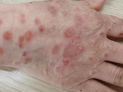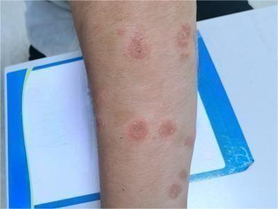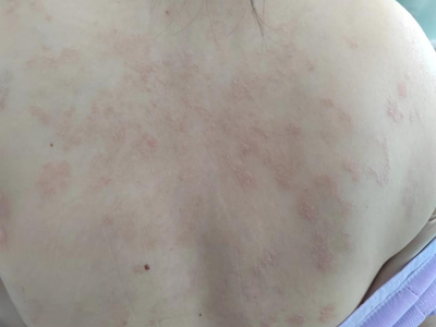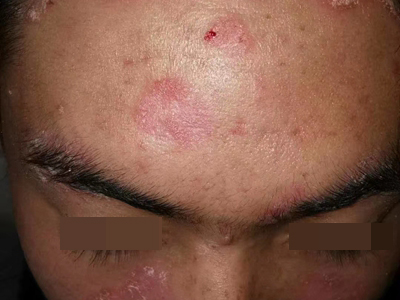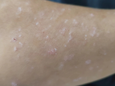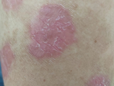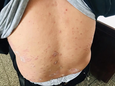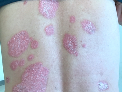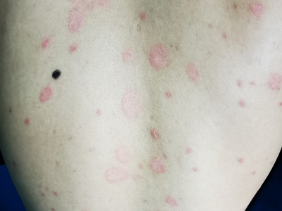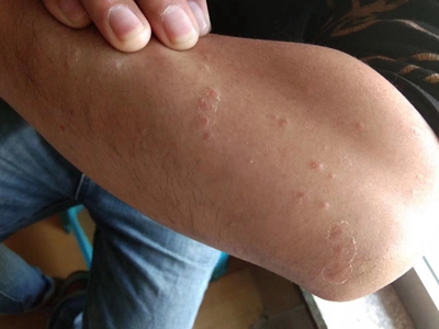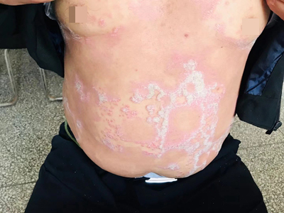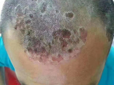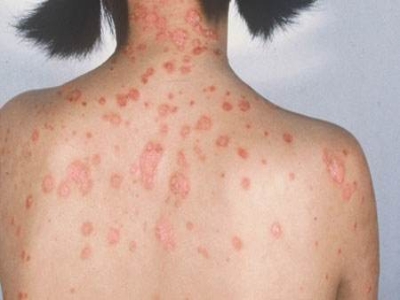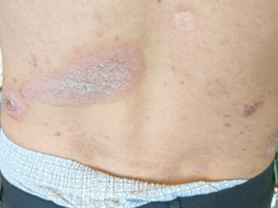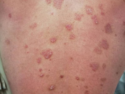 皮损可发生于全身各处,但以四肢伸侧,特别是肘部、膝部和骶尾部最为常见,常呈对称性。不同部位的皮损也有所差异,面部皮损多为点滴状浸润性红斑、丘疹或脂溢性皮炎样改变;头皮皮损鳞屑较厚,常超出发际,头发呈束状;腋下、乳房和腹股沟等皱褶部位常由于多汗和摩擦,导致皮损鳞屑减少并可出现糜烂、渗出及裂隙;少数损害可发生在唇、颊黏膜和龟头等处,颊黏膜损害为灰白色环状斑,龟头损害为边界清楚的暗红色斑块;甲受累多表现为“顶针状”凹陷。患者多自觉不同程度瘙痒。