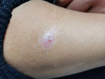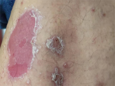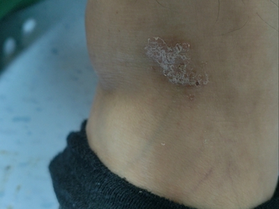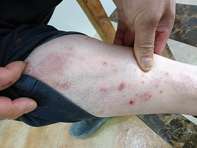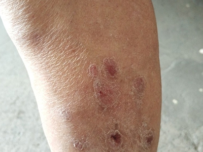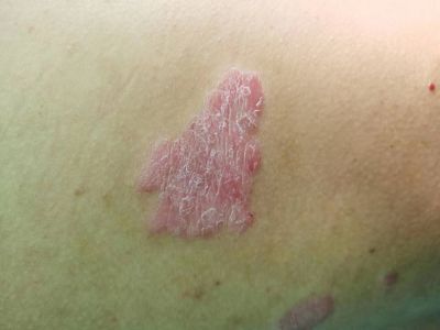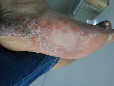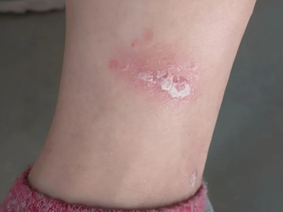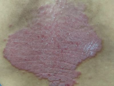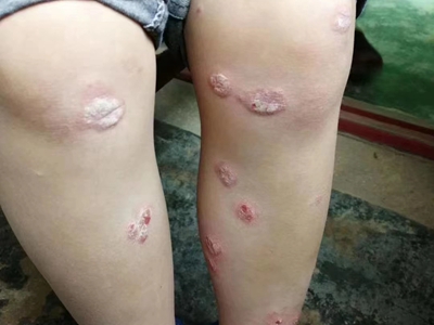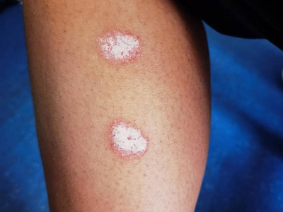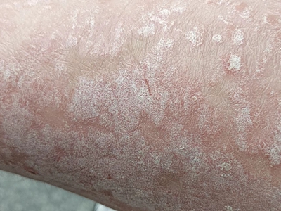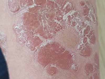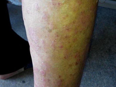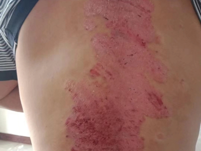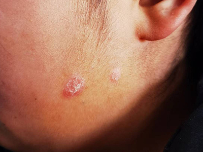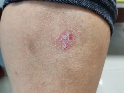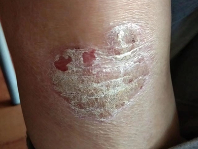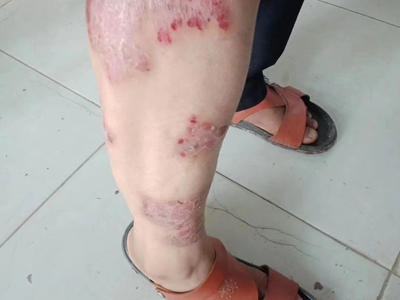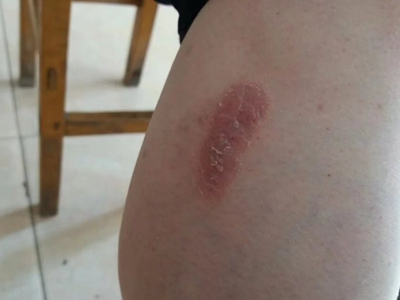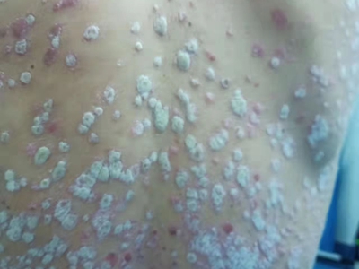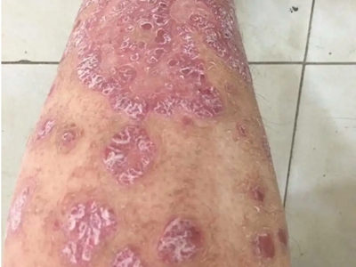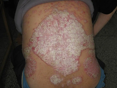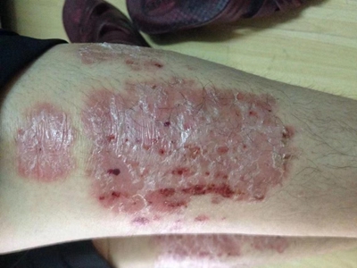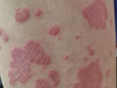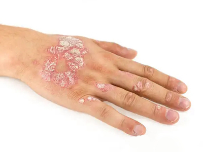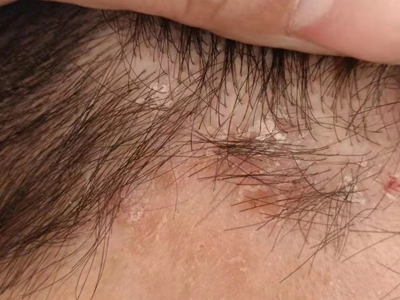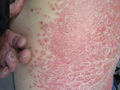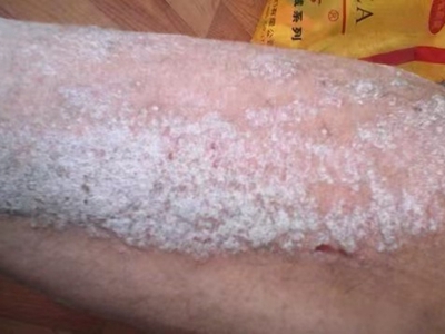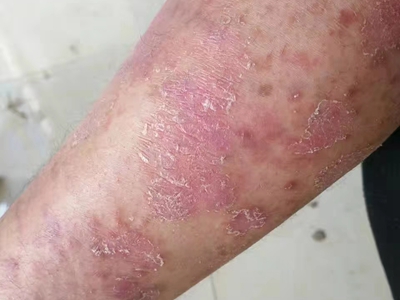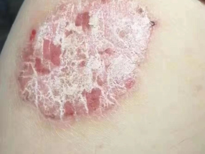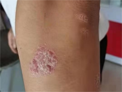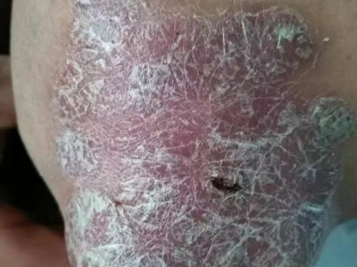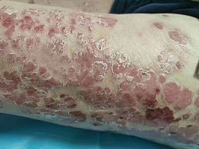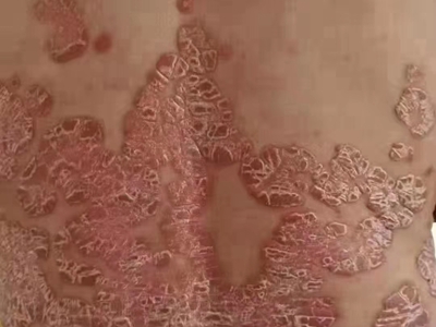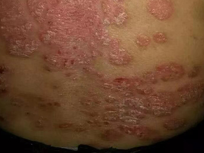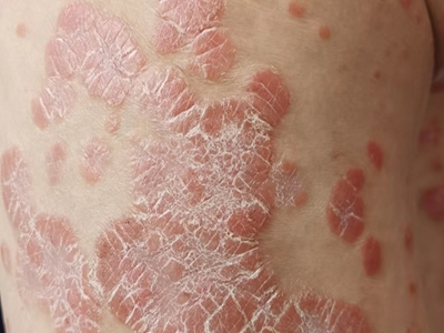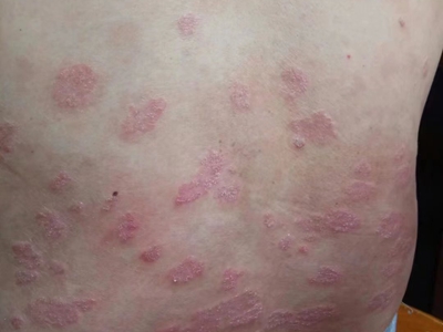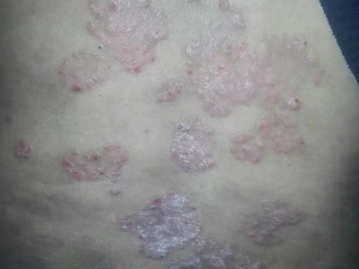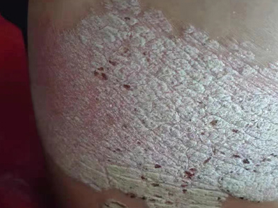 寻常型银屑病初起皮损为红色丘疹或斑丘疹,逐渐扩展成为边界清楚的红色斑块,可呈多种形态,如点滴状、斑块状、钱币状、地图状、蛎壳状等,上覆厚层银白色鳞屑。若刮除最上层的银白色鳞屑,可观察到鳞屑成层状特点,就像在刮蜡滴一样,刮去银白色鳞屑可见淡红色发光半透明薄膜,剥去薄膜可见点状出血。