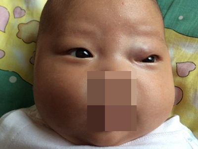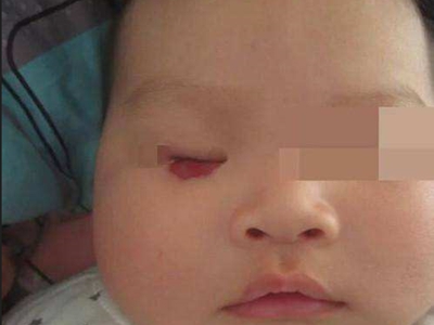 眼睑毛细血管瘤表现为眼睑上方有一个扁豆大小的包块,边缘不清,触之质地较软,表面皮肤略微发紫蓝色,受包块影响婴儿睁眼困难,遮盖部分眼球。