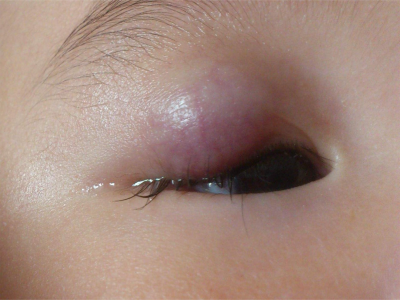 眼睑毛细血管瘤典型症状表现为上眼睑靠近内眼角位置有红色斑片,形态不规则,边界不清楚,触之柔软,哭闹时增大,是婴儿期最常见的良性肿瘤。