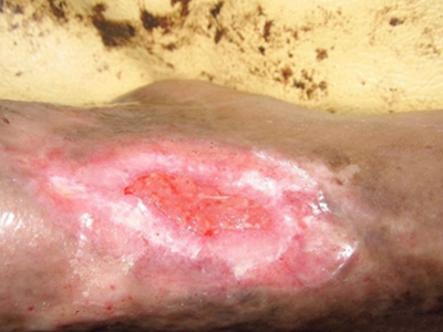 职业性皮肤溃疡患者小腿皮肤上出现圆形的溃疡面,溃疡中心有黄色、褐色的坏死组织,并且有少量的分泌物,周围皮肤呈干燥、粗糙的状态。