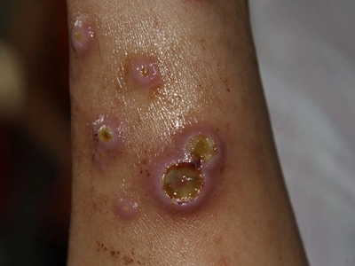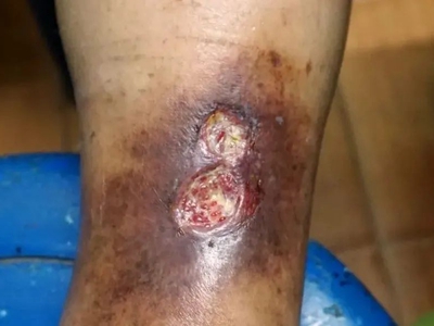 职业性皮肤溃疡在小腿部位出现溃疡时,未及时处理会出现溃疡面化脓的情况,溃疡面呈红色,与黄色脓液掺杂,患者疼痛剧烈。