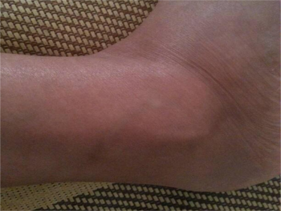 职业性皮肤溃疡出现在脚踝处时,能看到脚踝处皮肤水肿,明显增高,皮肤颜色略微发红,皮肤温度升高,走路时疼痛感较强烈,休息后会轻度缓解。