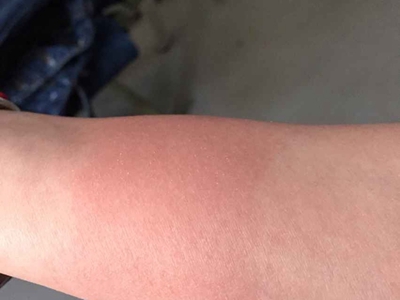 职业性皮肤溃疡在胳膊部位,皮肤会出现一圈红色,并且皮肤发红、肿胀,随着时间进展,红肿部位会蔓延至周围正常皮肤。