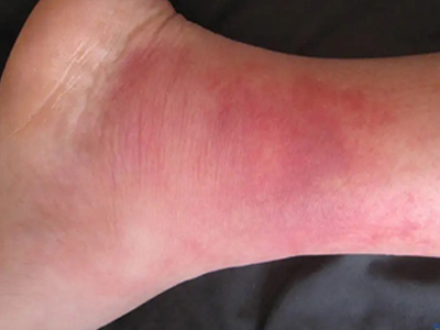 职业性皮肤溃疡出现在脚踝时,随着疾病进展,红肿部位上方会出现散在分布的血点,如果没有及时处理,血点部位会进一步发展至溃疡。