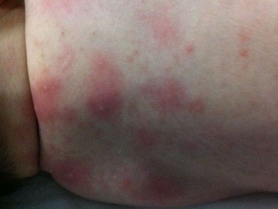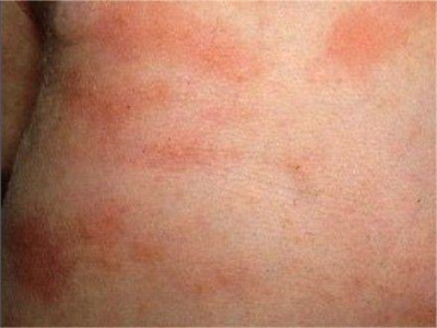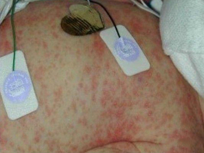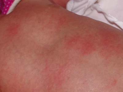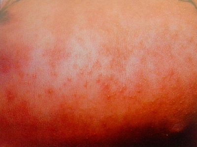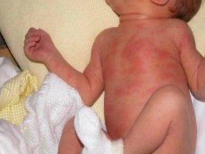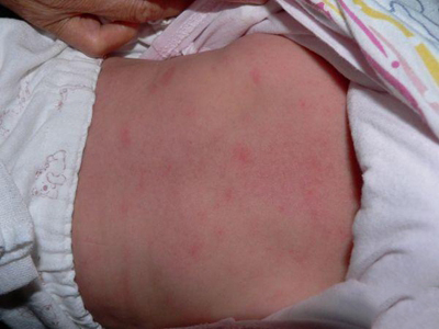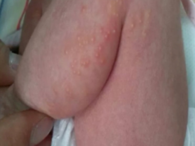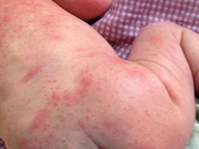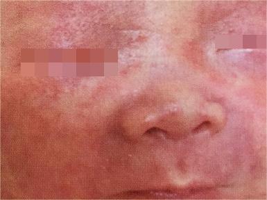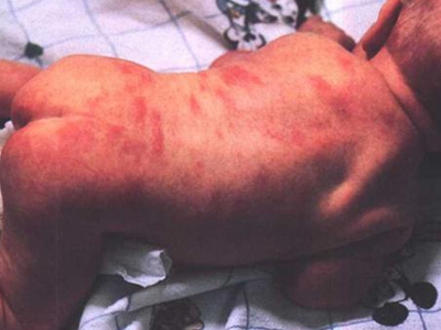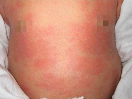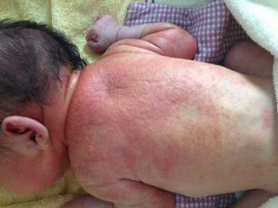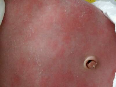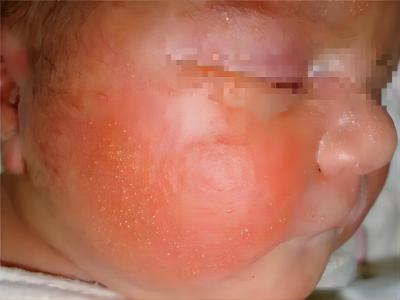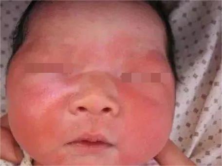 新生儿毒性红斑皮疹为泛发性红色斑片,边界模糊,几乎满布整个面部,但未侵犯前额,色鲜红,皮肤表面发亮有光泽。在红斑基础上有散在分布的红色小丘疹,数目较少,见于下巴部位。