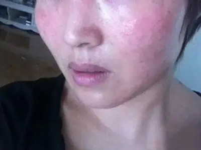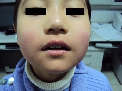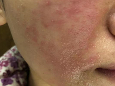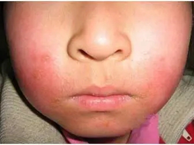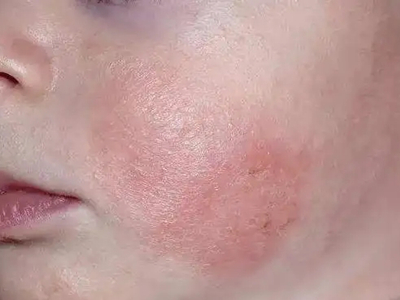 芒果皮炎患者脸颊上表现为不规则形状的红斑,局部有小疙瘩,可以呈对称分布,患者会有强烈的瘙痒感,症状严重时还会有皮肤破损、结痂。