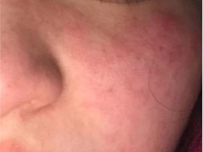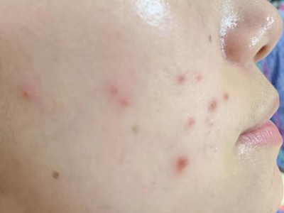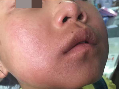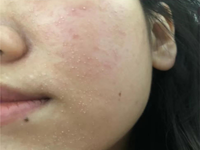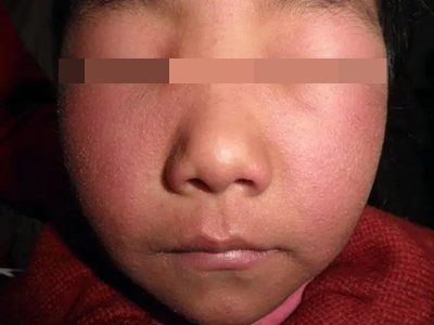 脸部是芒果皮炎的好发部位,主要表现为局部皮肤潮红、肿胀,潮红斑上布满了微微凸起的小丘疹,皮肤有瘙痒感、紧绷感,常不自觉抓挠而加重皮损。
