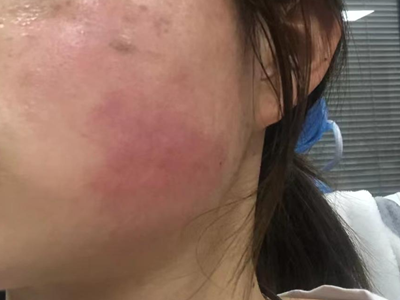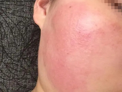 芒果皮炎皮损可以发生在脸颊上,表现为不规则的红色斑块,表面光滑,边界清晰,有轻度肿胀,出现在接触芒果后的当天或者1-2天。